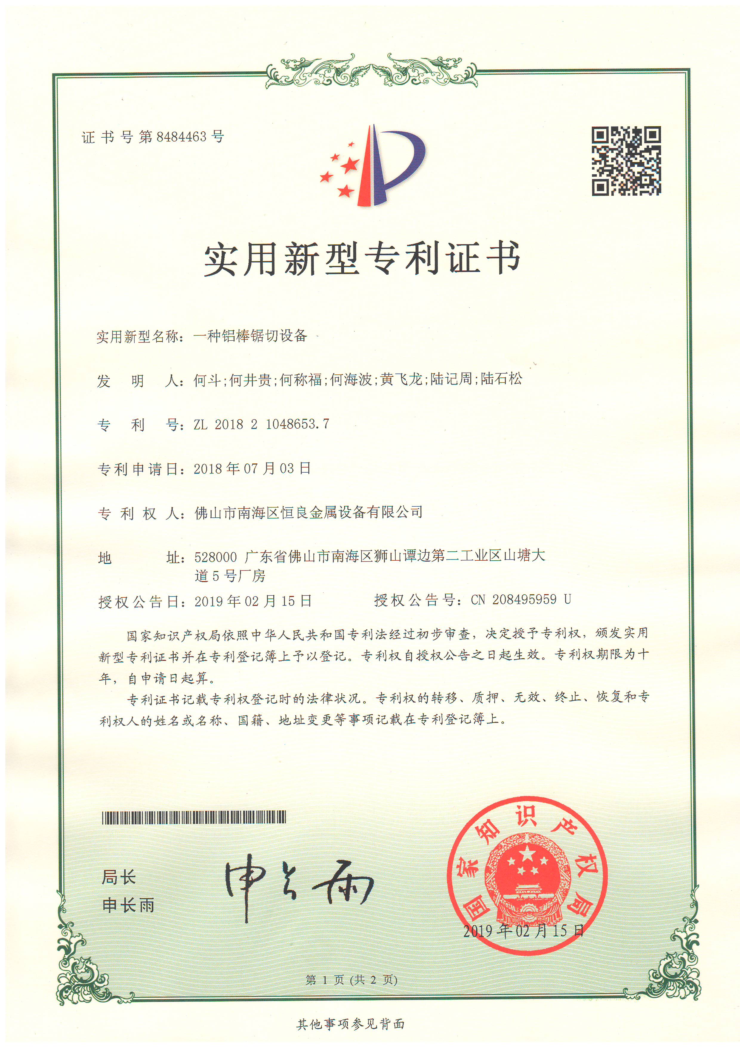 应用于铝棒锯切设备上的自动锯切机构专利证书