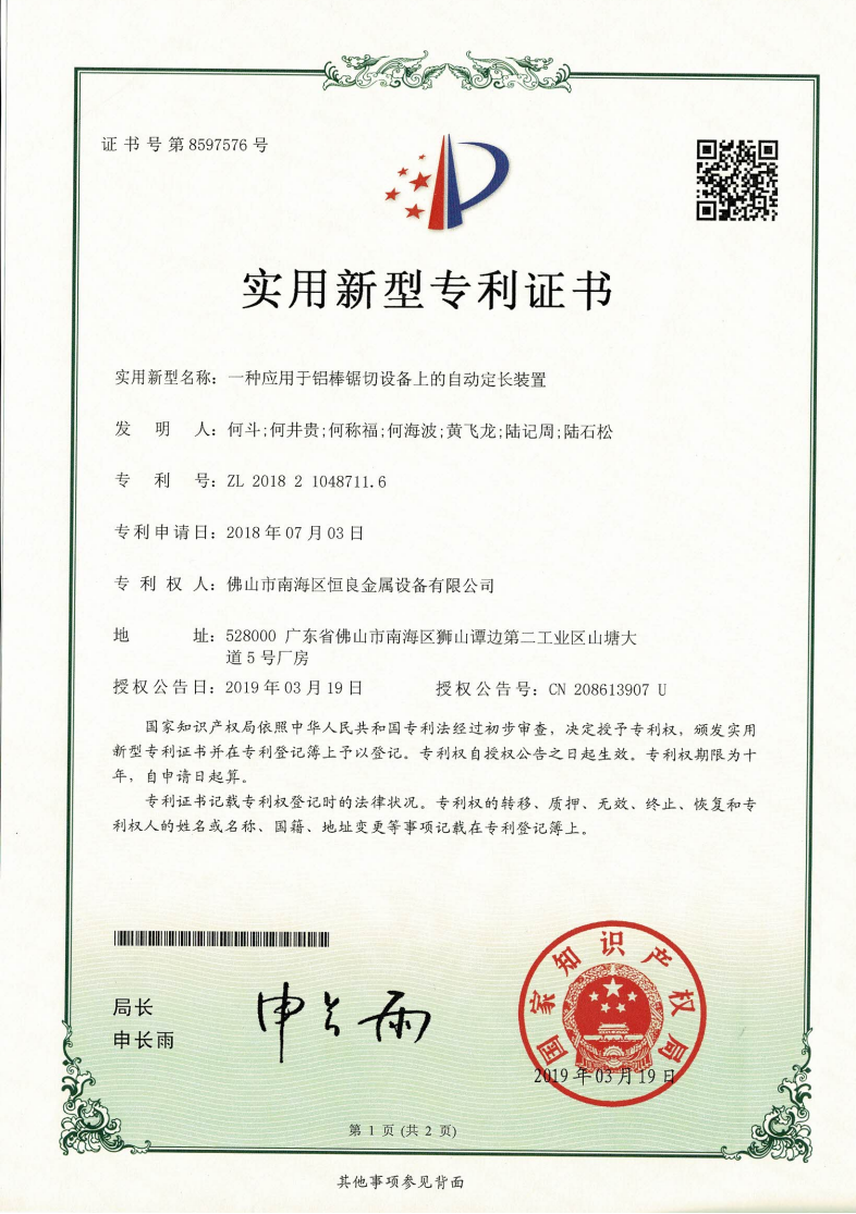 应用于铝棒锯切设备上的自动定长装置专利证书